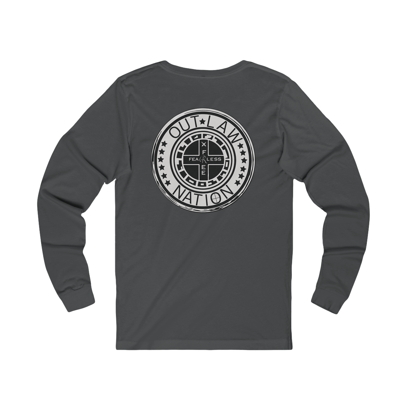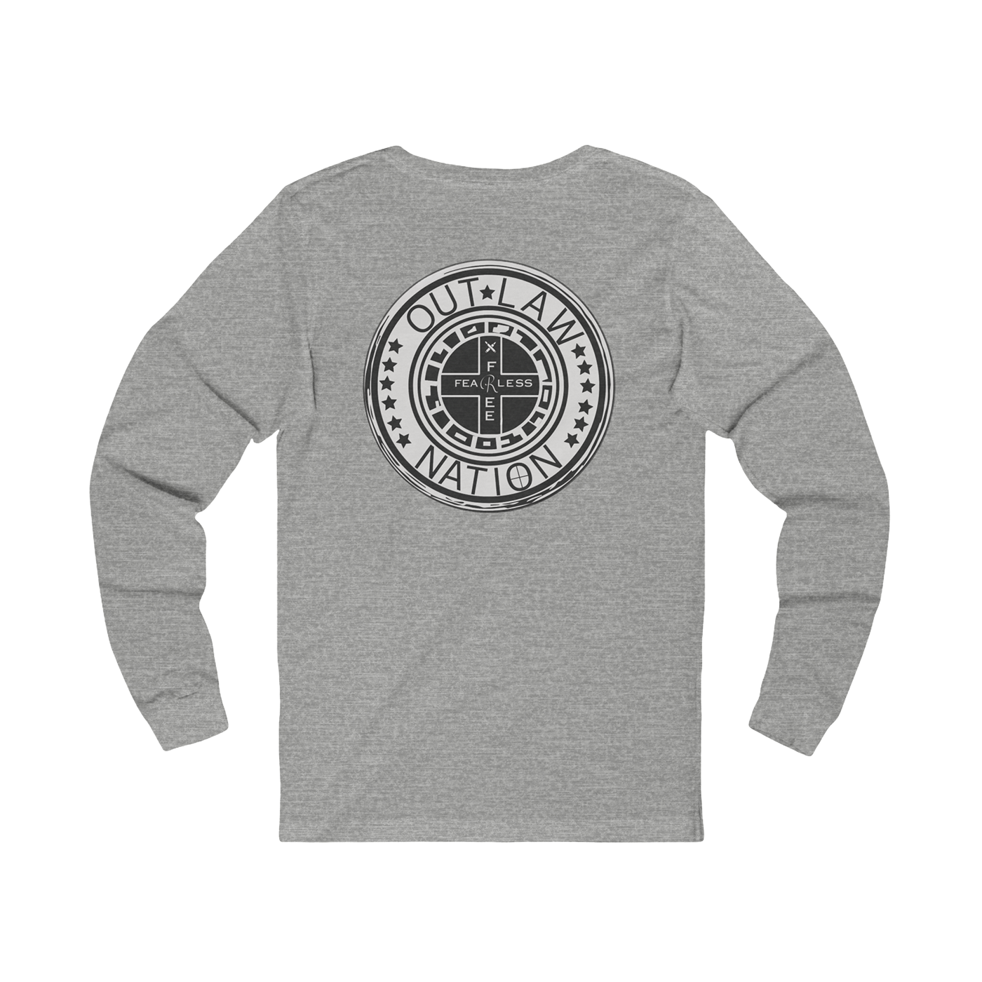 This long-sleeve shirt from Fearless & Free Outlaw Nation is more than apparel — it’s a badge of honor. Featuring a bold circular emblem stamped across the back, this design declares your allegiance to freedom, independence, and unapologetic authenticity. With “OUTLAW NATION” wrapped around a shield-inspired graphic and flanked by stars, it’s made for those who live outside the lines