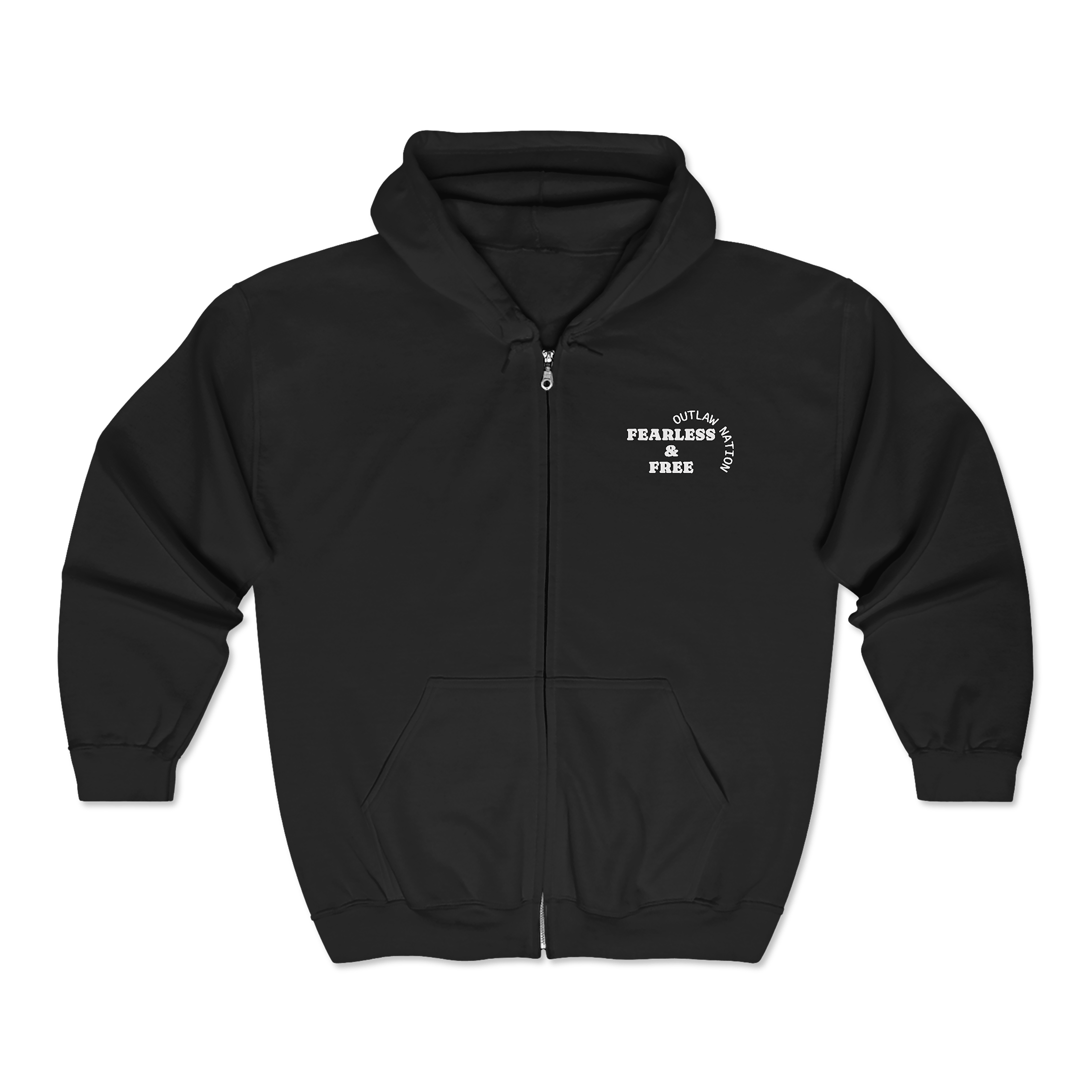 A rugged full-zip hoodie that feels like a trusted companion on long drives, late-night bonfires, and weekend escapes. The black zip-up silhouette carries bold white graphics: a small chest emblem and a larger back design reading “FEARLESS & FREE” above a wreath and anchor motif with “OUTLAW NATION” beneath. The medium-heavy 50/50 cotton-poly blend holds shape and warmth without feeling bulky. Thoughtful details — a roomy hood with drawstring, metal zipper, deep front pockets, and optional left-chest embroidery — make this hoodie functional and ready for wear. It’s made without side seams for a clean look and less waste, and printed with a mix of DTG and DTF for crisp wrist and body details. Built to last and backed by an EU two-year warranty.